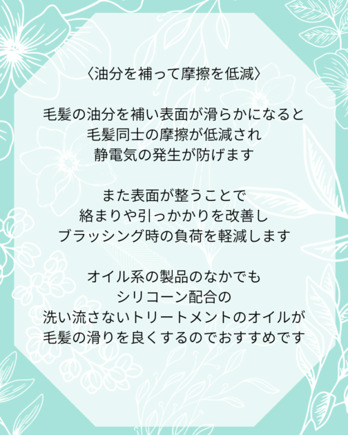 オイル系の製品よ中でもシリコーン配合の洗い流さないトリートメ ントオイルが毛髪のすべりを良くするのでおすすめです